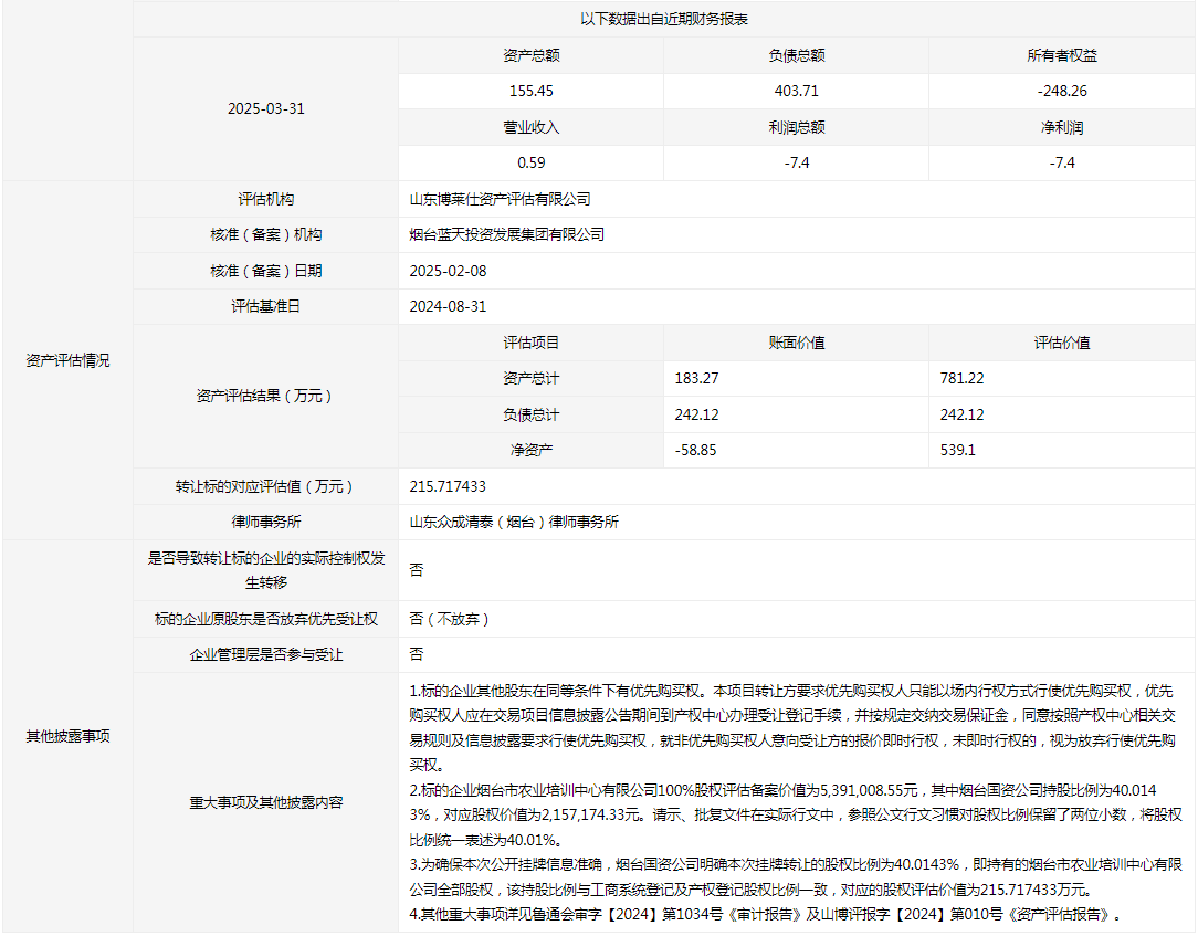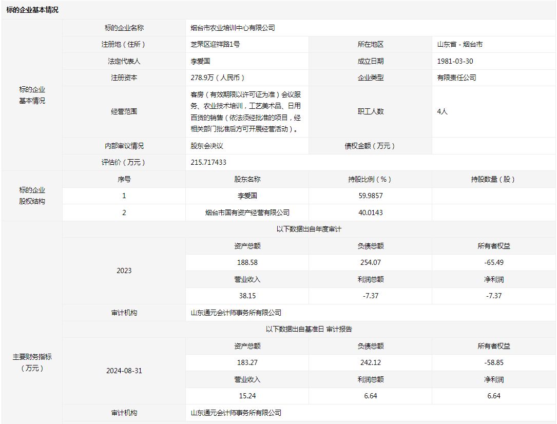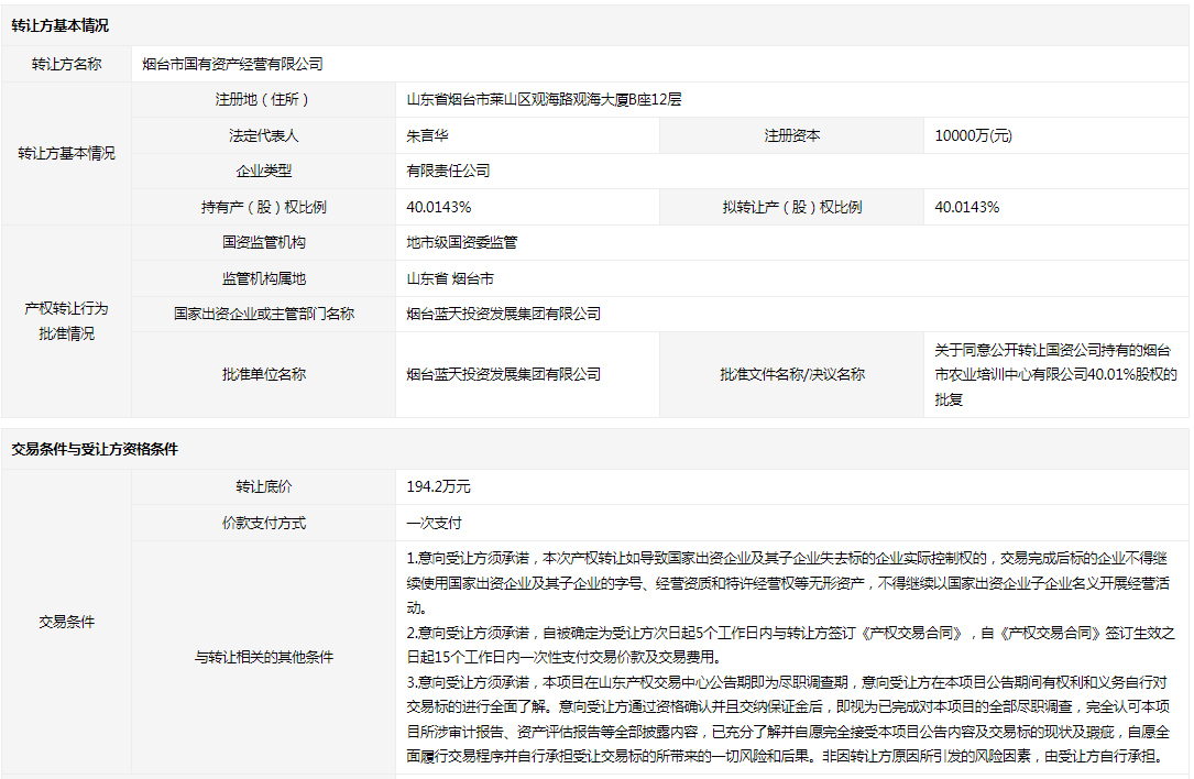 煙臺市農(nóng)業(yè)培訓中心有限公司40.0143%國有股權(quán)