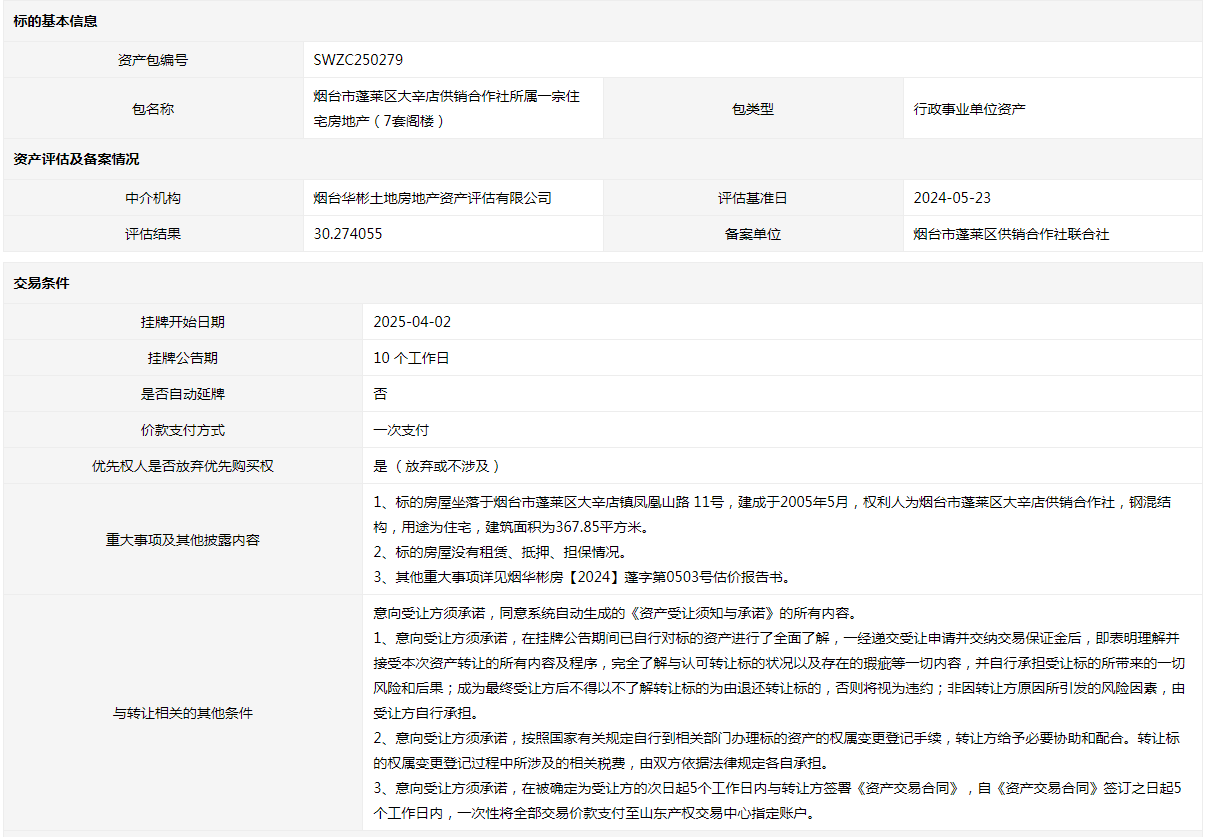 煙臺市蓬萊區(qū)大辛店供銷合作社所屬一宗住宅房地產(chǎn)(7套閣樓)