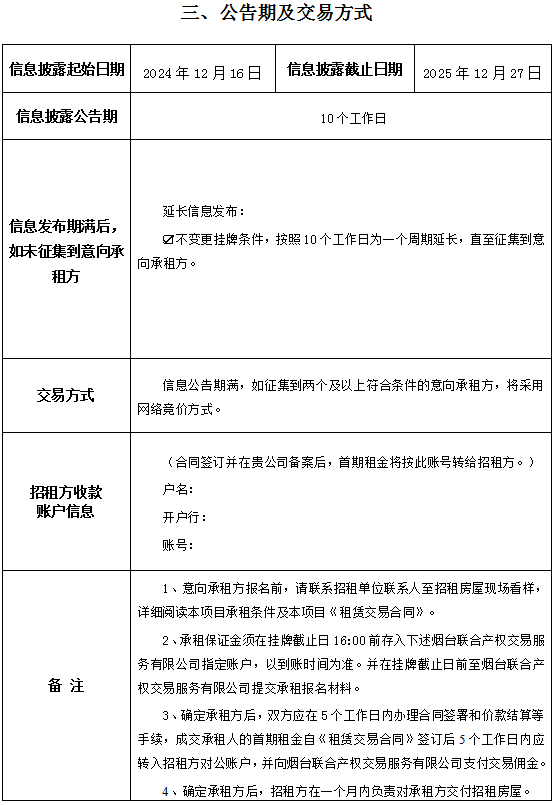 掛牌起止日期:2024年12月16日至2024年12月27日