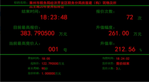 近日,萊州市稅務(wù)局經(jīng)濟(jì)開發(fā)區(qū)稅務(wù)分局所屬房屋建筑物及所占土地20年使用權(quán)轉(zhuǎn)讓項(xiàng)目在煙臺(tái)產(chǎn)權(quán)掛牌并有多個(gè)意向受讓方報(bào)名,最終,經(jīng)過72輪激烈報(bào)價(jià),項(xiàng)目較掛牌底價(jià)122萬(wàn)元,增值261萬(wàn)元,增值率高達(dá)212.56%,不但保證了疫情期間國(guó)有產(chǎn)權(quán)業(yè)務(wù)的正常開展,而且?guī)椭a(chǎn)權(quán)持有人實(shí)現(xiàn)了價(jià)值最大化。